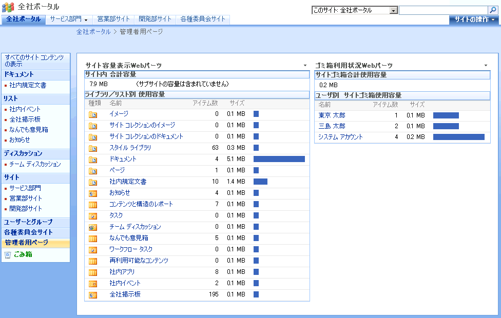 サブサイト、ライブラリ/リスト毎の容量レポートを行うことにより、きめ細かくポータル全体の容量管理ができます。